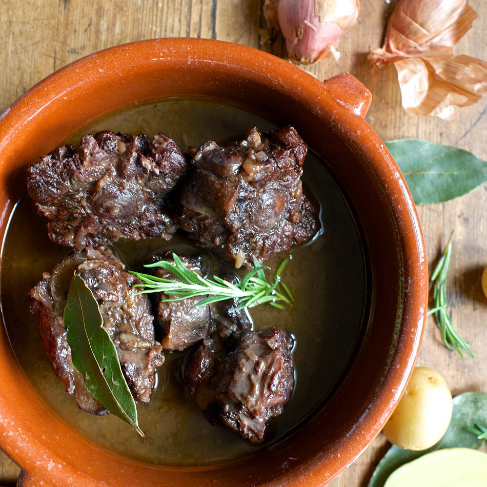 Condire i pezzi di carne con sale e pepe, friggere su entrambi i lati in olio d'oliva caldo e mettere da parte. Tagliare le verdure di vostra scelta in pezzi e friggerle con il concentrato di pomodoro nella padella. Aggiungere i pezzi di carne e cospargere con un po' di farina. Deglassare con il vino rosso e aggiungere un po' di brodo e le erbe di vostra scelta. Cuocere a fuoco lento per circa 2,5 - 3 ore fino a quando la carne si stacca dall'osso. Filtrare la salsa attraverso un setaccio e far bollire di nuovo brevemente. La polenta, per esempio, è un ottimo contorno.