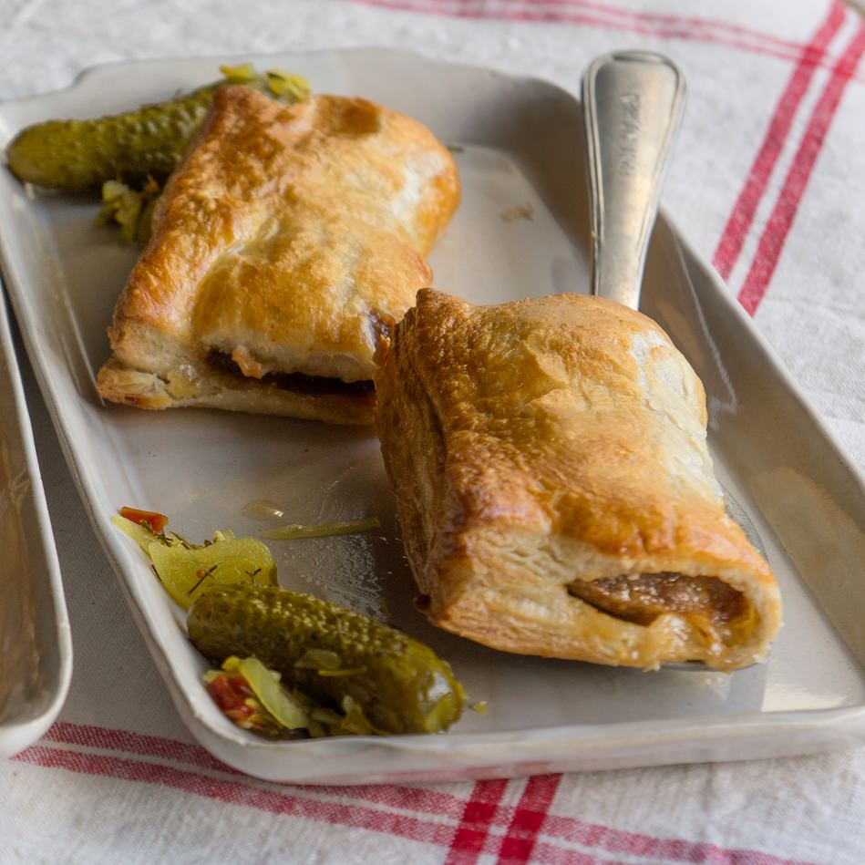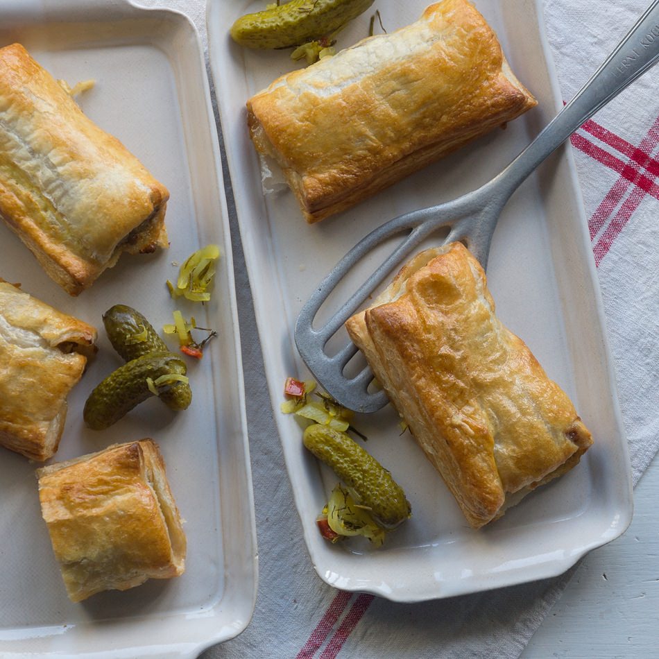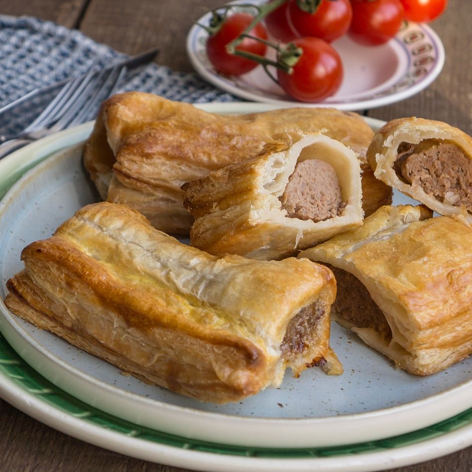 Carne di cinghiale e di cervo, Sel des Alpes, paprika, paprika affumicata, aneto, levistico, pepe rosso, coriandolo, dragoncello, aglio, cipolle, pangrattato fatto in casa Pasta sfoglia: farina bianca, margarina, sale marino, acqua