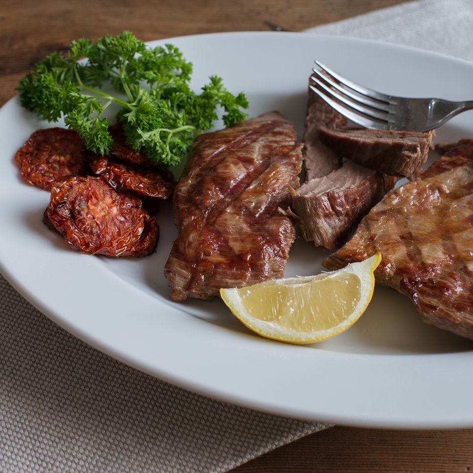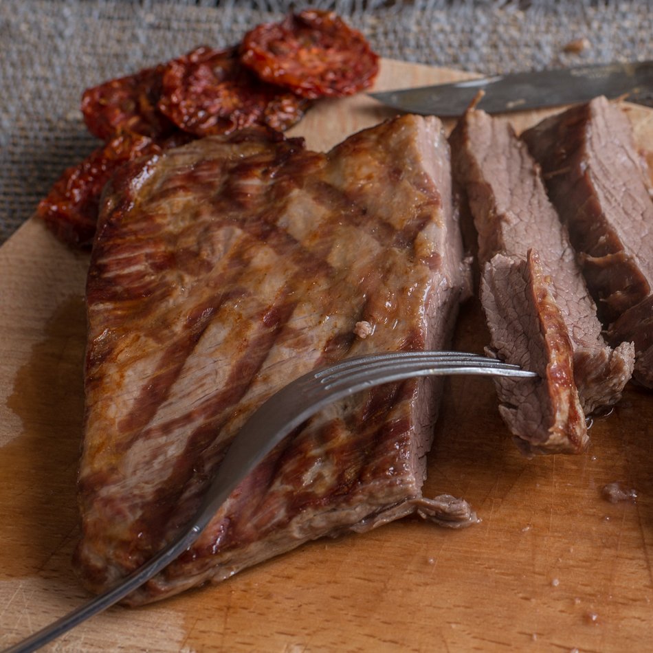 La Flank Steak (bavetta), piatta, relativamente magra con fibre lunghe e un sapore intenso, è un taglio del diaframma. Ideale da marinare e cuocere brevemente.