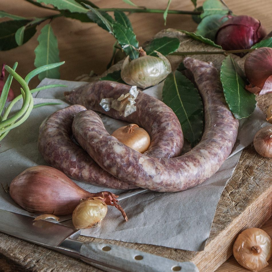 Carne di manzo Highland 70%, maiale 30%, pancetta di maiale di razza Mangalica, sale, noce moscata, pepe, cannella, aromi naturali, budello di maiale