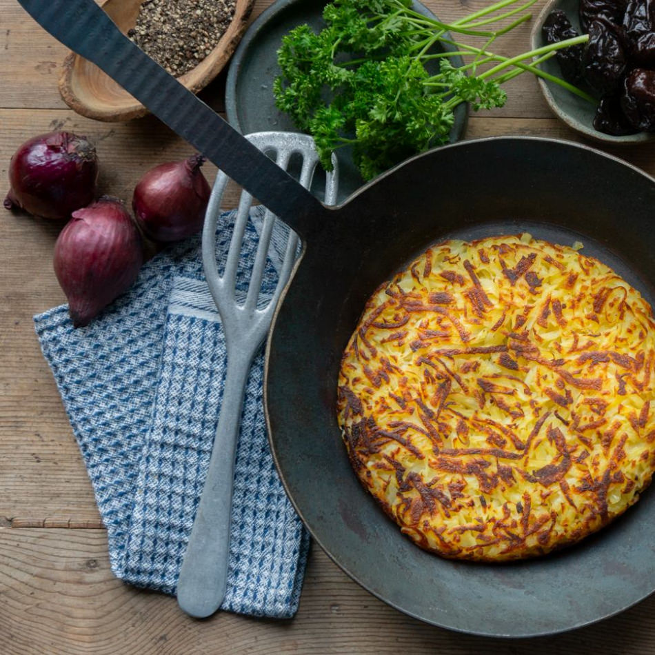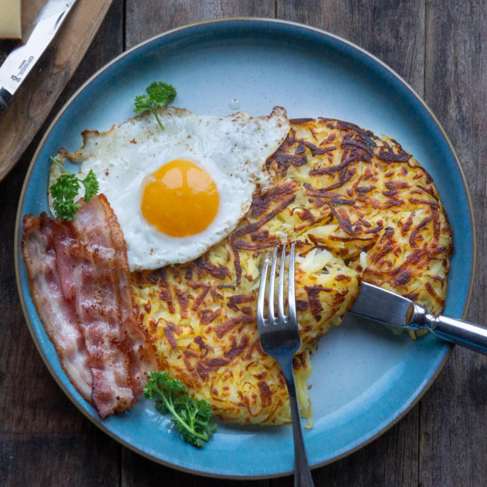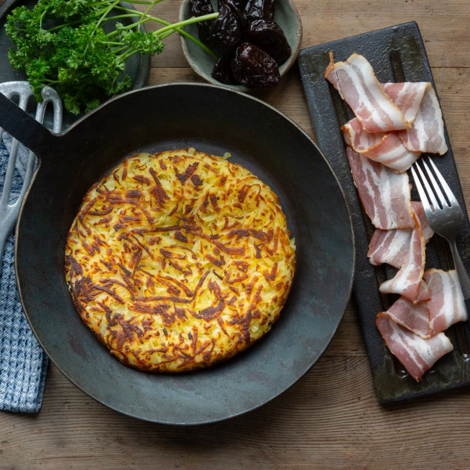 Rösti bei kleiner Hitze anbraten, bis sich eine schöne braune Kruste gebildet hat.