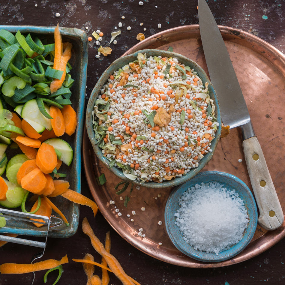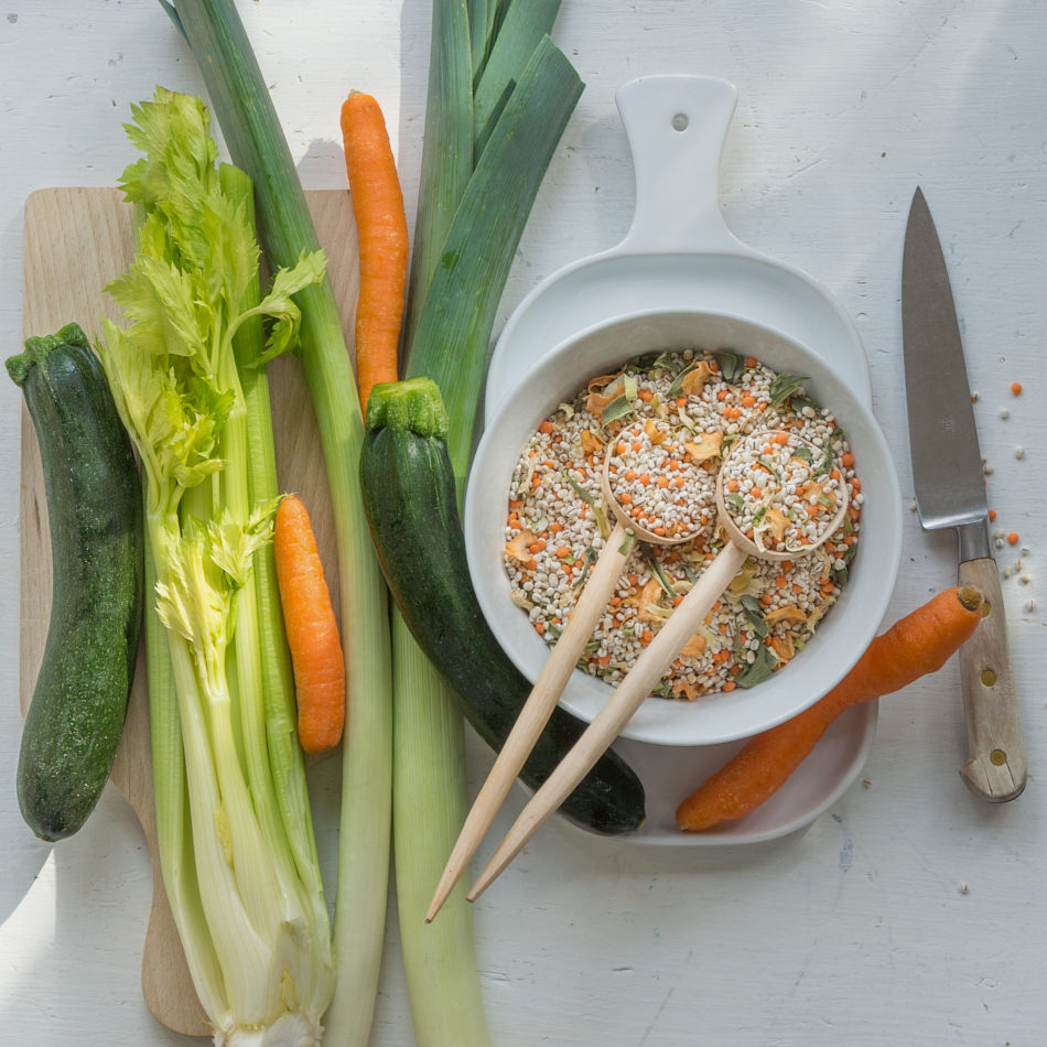 Rollgerste, rote Linsen, Karotten, Lauch, Stangensellerie, Zucchetti