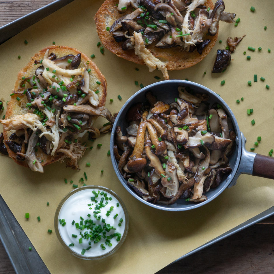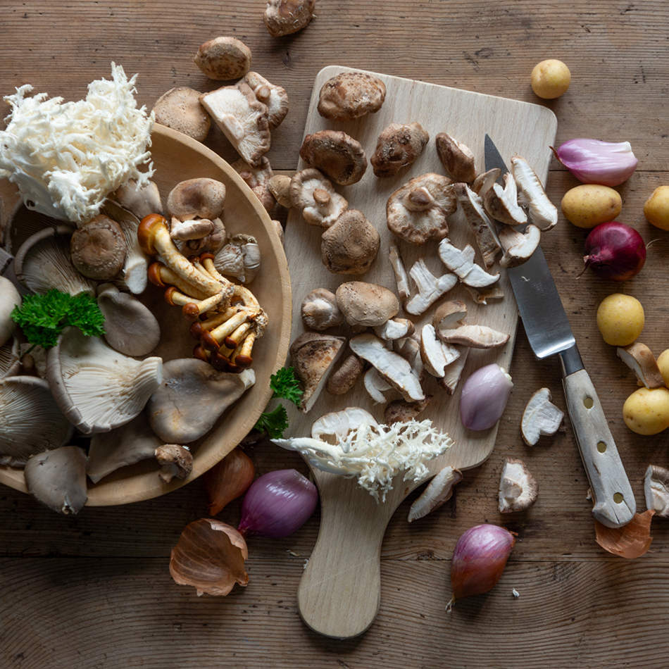 Die Edelpilzmischung besteht aus vier verschiedenen Pilzsorten: Shiitake, Austernseitling, Ästiger Stachelbart und Nameko.