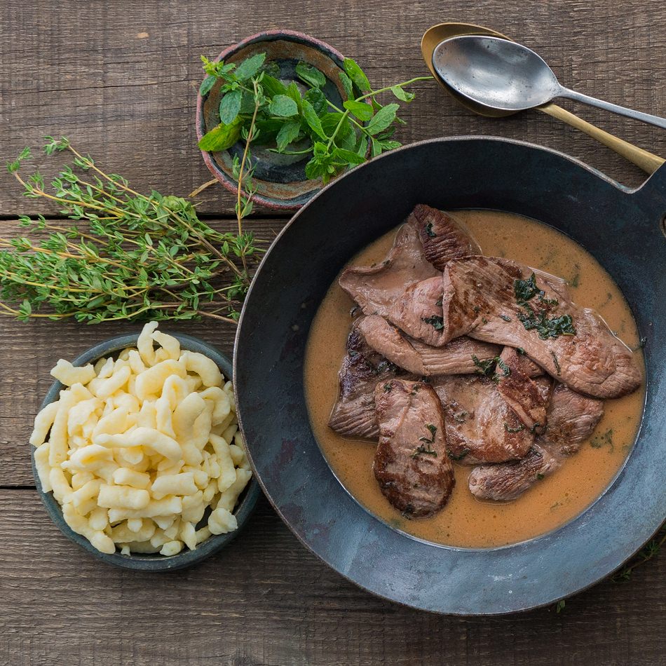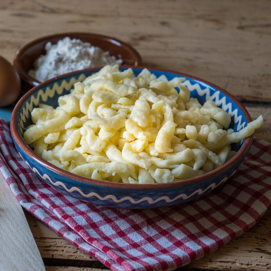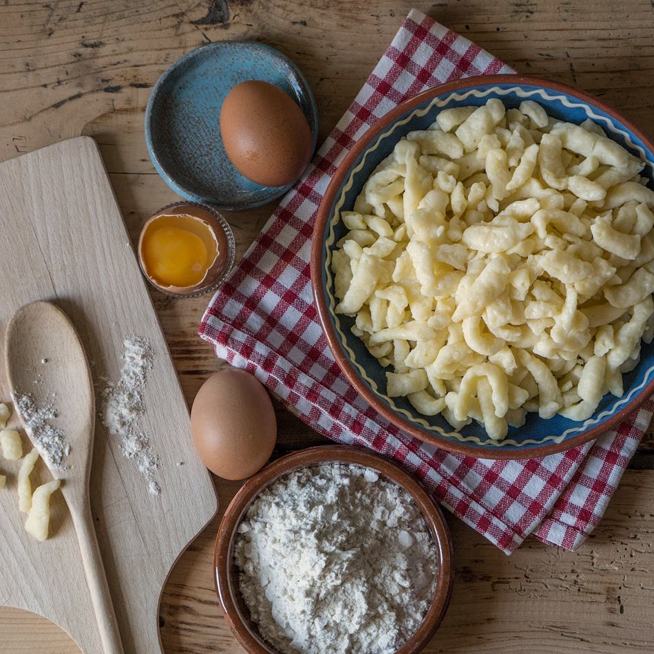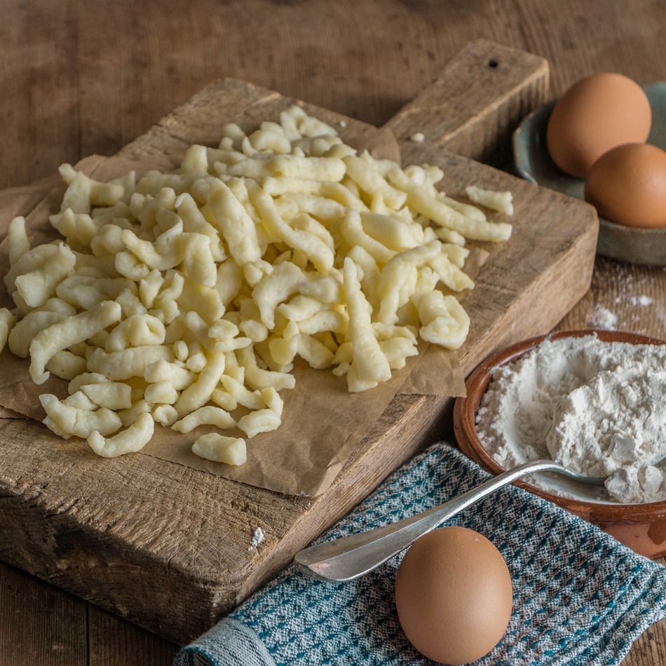 Unsere feinen Spezial Eierspätzli sind handgemacht mit unseren eigenen Eiern vom Ulmberg. Perfekt als Beilage zu unseren Wildgerichten oder einfach so mit etwas Reibkäse garniert.