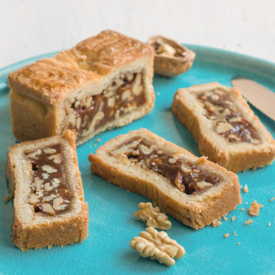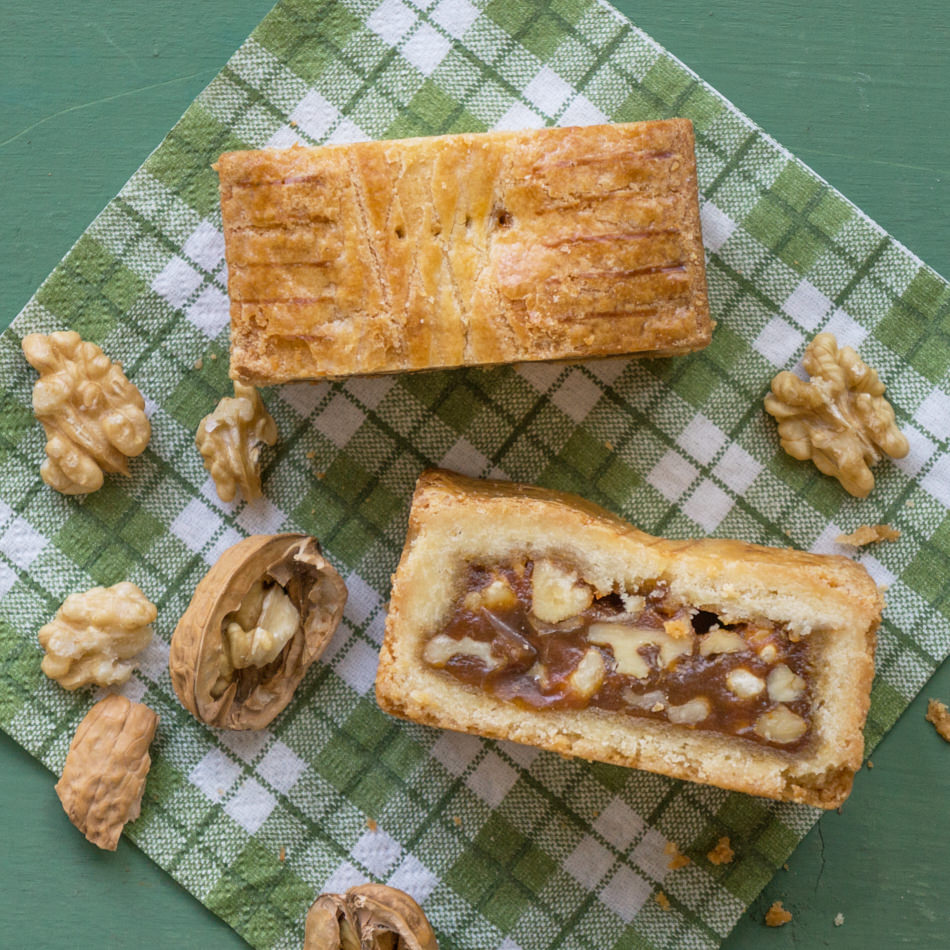 Dinkelmehl, Rahm, Baumnüsse, Rohrrohrzucker, Butter, Zucker, Eier, Honig, Zitrone, Orange, Salz