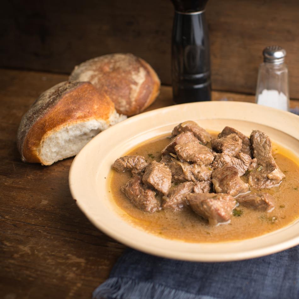 Fleisch vom Hochlandrind, Öl, Butter, Salz, Pfeffer, Zwiebeln, Karotten, Sellerie, Tomaten, Knoblauch, Rotwein, Maismehl, Petersilie, Tomatenmark